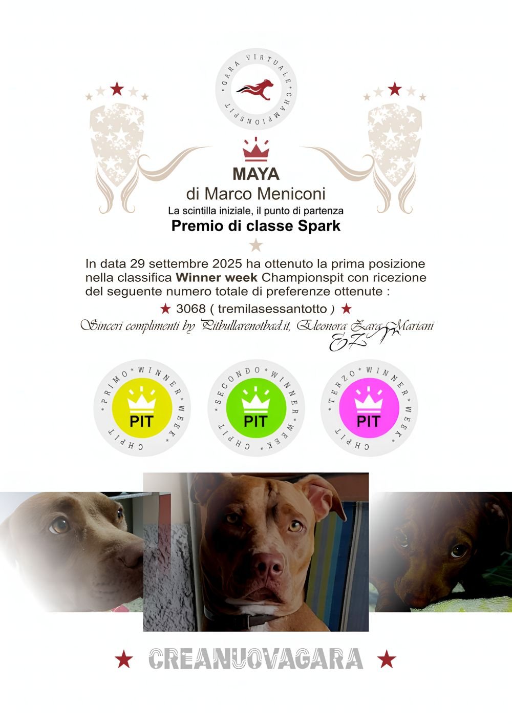In data 29 settembre 2025 ha ottenuto la prima posizione nella classifica Winner week Championspit con ricezione del seguente numero totale di preferenze ottenute :