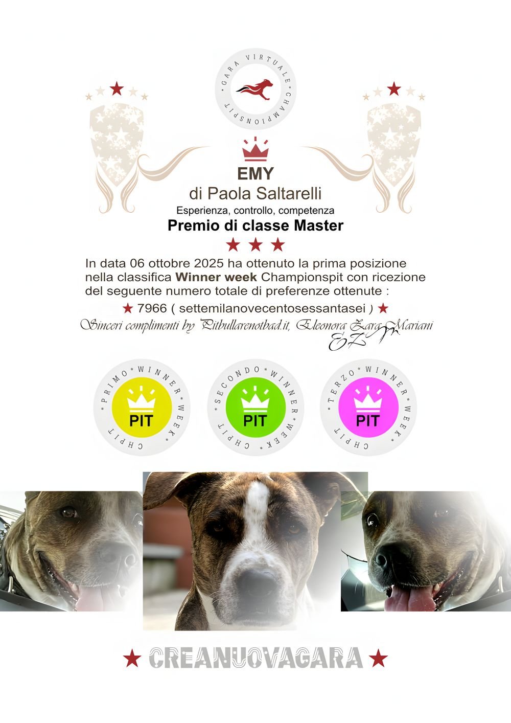 In data 06 ottobre 2025 ha ottenuto la prima posizione nella classifica Winner week Championspit con ricezione del seguente numero totale di preferenze ottenute :