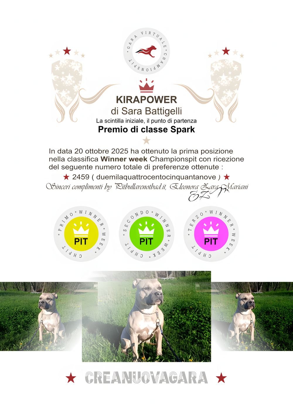 In data 20 ottobre 2025 ha ottenuto la prima posizione nella classifica Winner week Championspit con ricezione del seguente numero totale di preferenze ottenute :