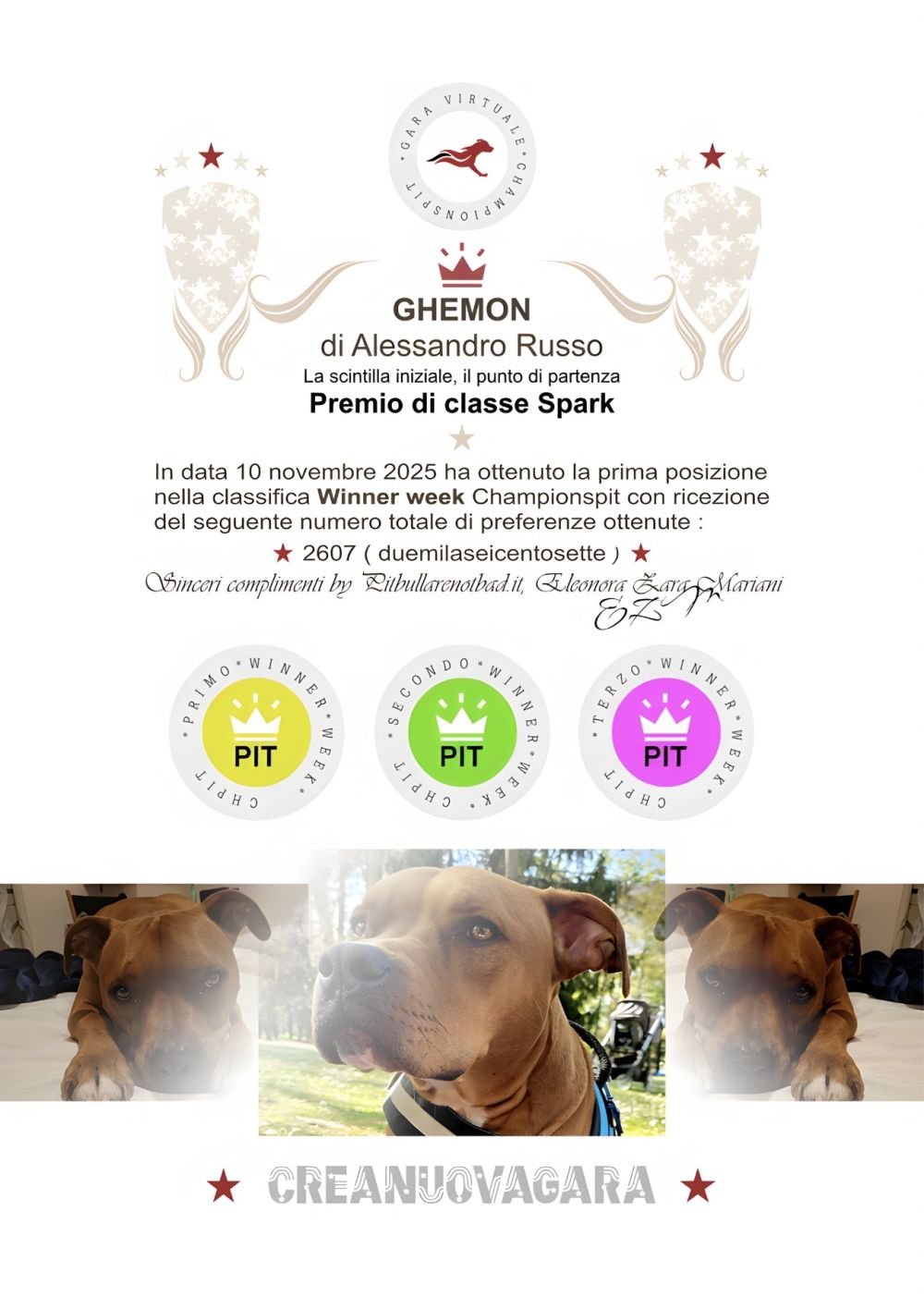 In data 10 novembre 2025 ha ottenuto la prima posizione nella classifica Winner week Championspit con ricezione del seguente numero totale di preferenze ottenute :