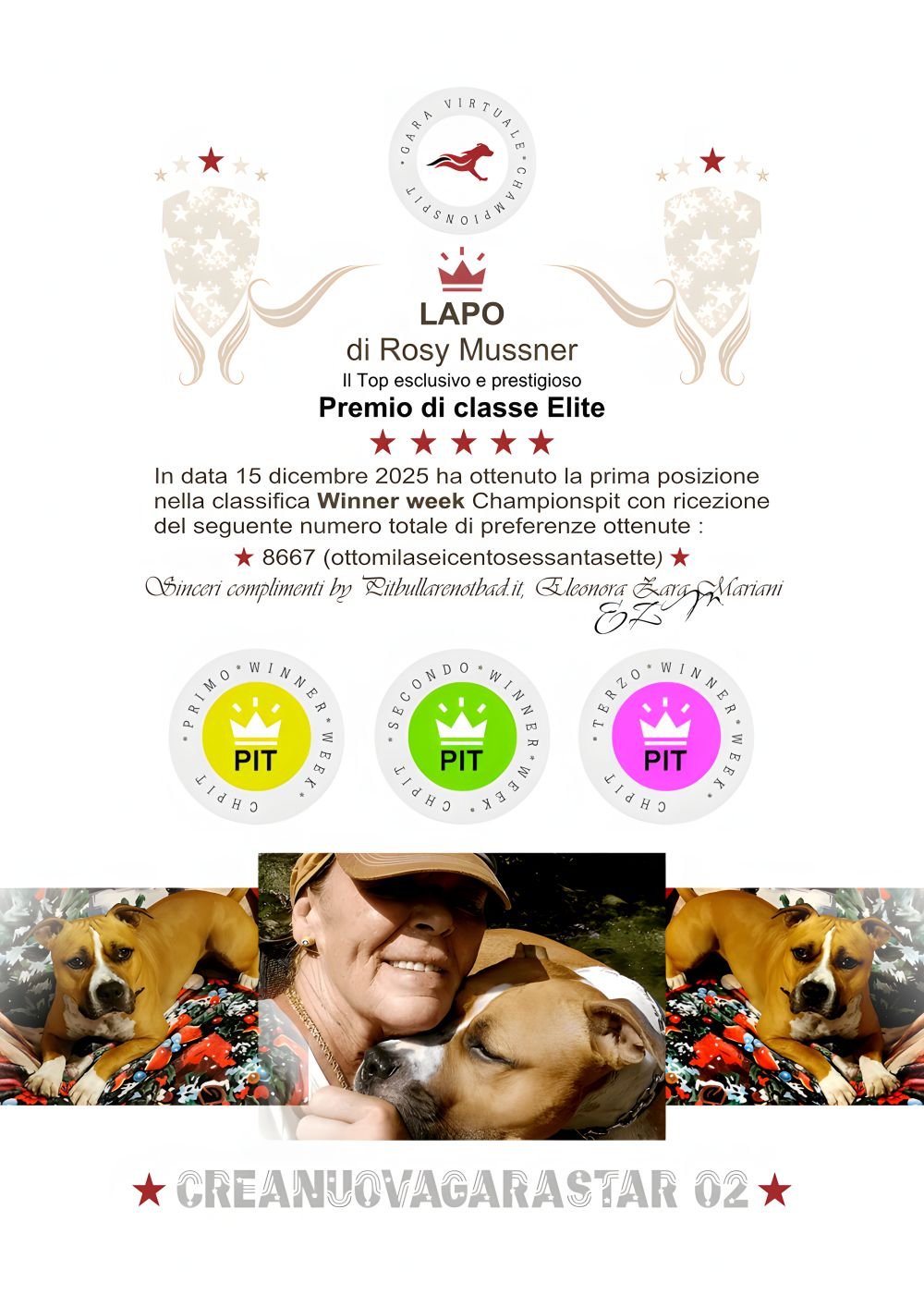 In data 15 dicembre 2025 ha ottenuto la prima posizione nella classifica Winner week Championspit con ricezione del seguente numero totale di preferenze ottenute :