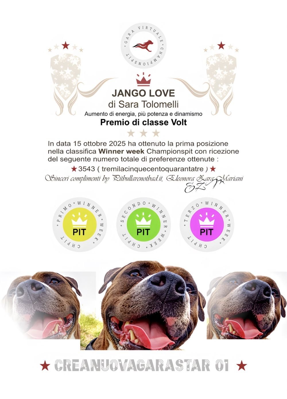 In data 15 ottobre 2025 ha ottenuto la prima posizione nella classifica Winner week Championspit con ricezione del seguente numero totale di preferenze ottenute :