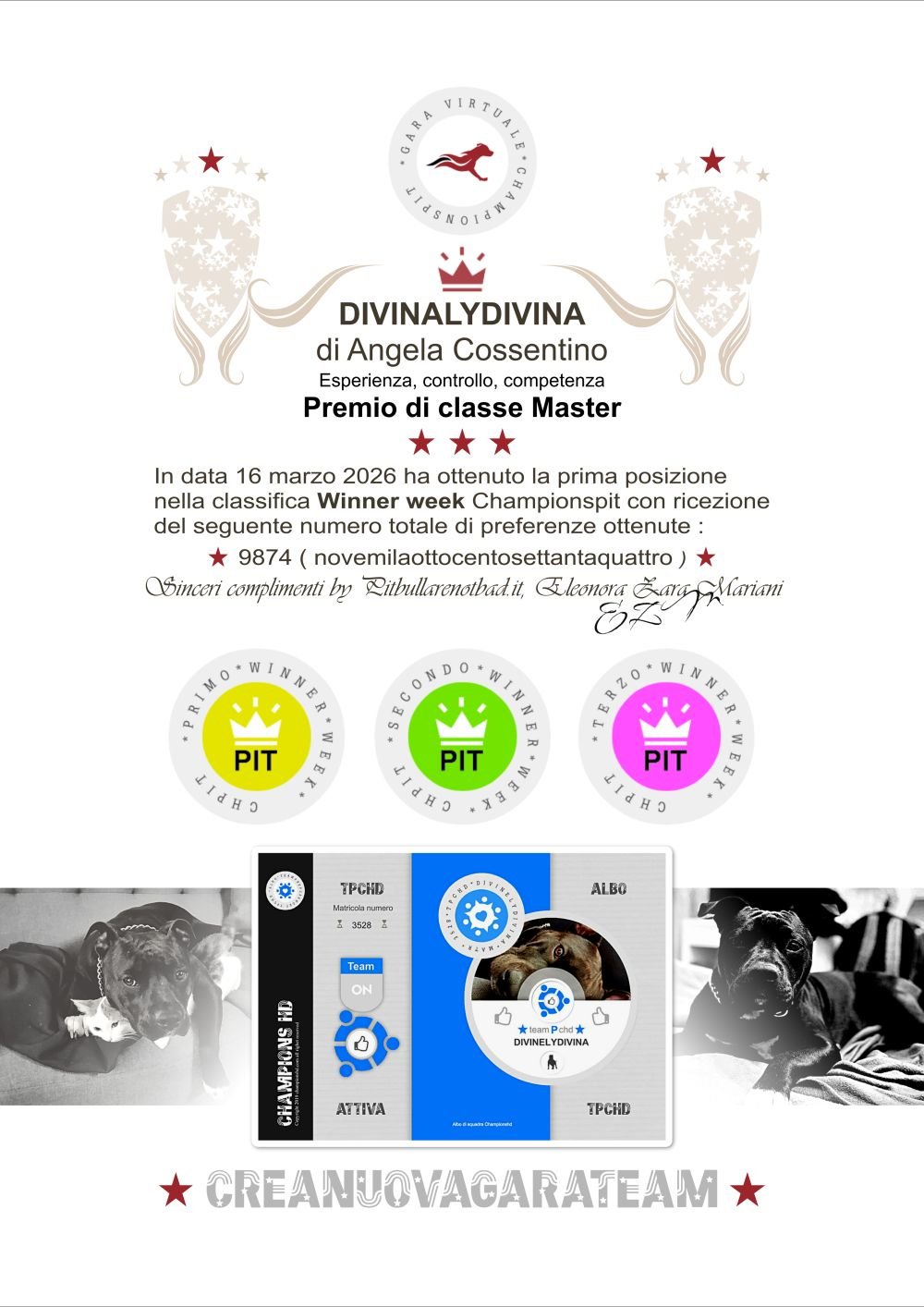 In data 16 marzo 2026 ha ottenuto la prima posizione nella classifica Winner week Championspit con ricezione del seguente numero totale di preferenze ottenute :