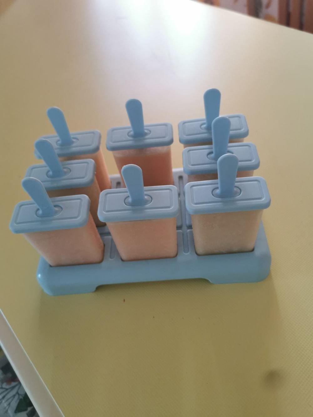 Melone yogurt greco magro mezzo cucchiaino di miele. Frullo tutto e metto negli stampini dei ghiaccioli. Puoi farli anche con banana e mela o mela e carota (lessa)