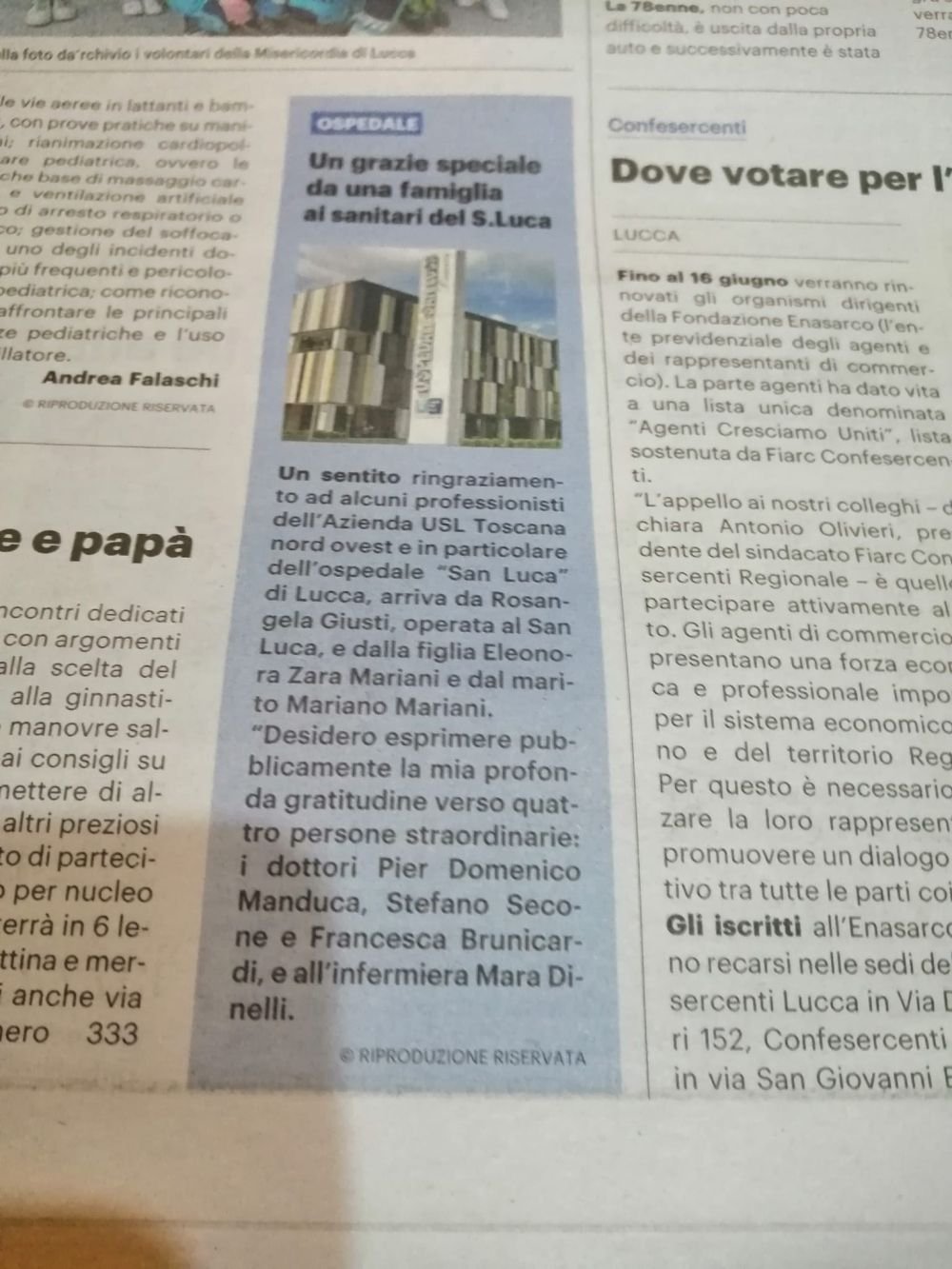 Un sentito ringraziamento anche a tutto il reparto di Chirurgia del San Luca di Lucca per la gentilezza, l’attenzione e la cura dimostrate in ogni momento.