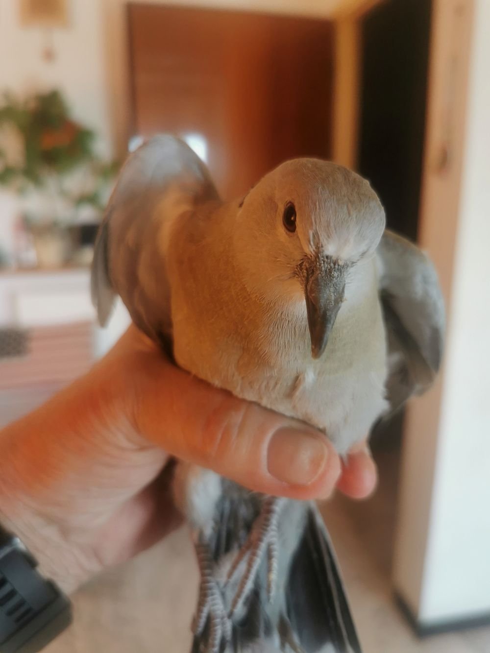 Ieri Lapo mi ha fatto il regalo di Pasqua. Era in giardino lo controllavo dal terrazzo gironzolava tranquillo. Ad un certo punto me lo sono visto arrivare in cucina di corsa con qualcosa in bocca. Era una giovane tortora che ha trovato a terra in giardino. L'ha posata sul tappeto. Ho notato che aveva una ferita con il sangue ragrumato su un'ala. Senz'altro si è ferita urtando un cavo della corrente. L'ho pulita con della fisiologica e applicato un po' di Hypermix. Stava bene era bella vispa un po' sbavata e con qualche piuma in meno persa durante il trasporto 🤦🏼Gli ho dato un po' d'acqua con una siringa e ho provato a dargli un pezzetto di mela gratuggiata con un po' di patè di carne (nn avevo semini in casa) l'ho riposta in una scatola con una copertina. Ho chiamato la Cras più volte mi hanno detto che sarebbero venuti a prenderla ma nn l'hanno fatto...stamani è ancora viva più tardi proverò a richiamare sperando con più fortuna. Sei stato bravo Lapo nn gli hai fatto del male l'hai portata a casa perché me ne prendessi cura 💙